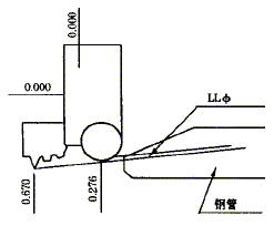 - 471型車絲機外圓車刀的切削深度主要取決于套管的LL¢值及套管壁厚偏差。由圖2可知,車絲刀桿頂點到外圓車刀A點的距離為(X1+0.482)”,等于外圓刀桿頂點到外圓車刀B點的距離X2。因此,6把外圓車刀在刀盤上的徑向距離相等,即加工時外圓車刀的切削深度相同。加工螺紋時,應以3#車絲刀桿加工1;16錐度至套管管端、3:螺紋梳刀精車齒頂至套管的LL¢位置為基準調整刀具位置,如圖4所示。