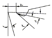 - 目前使用的PMC外圓車刀幾何參數如圖5所示。為形成刀具的工作后角,PMC外圓車刀刀座刀窩在水平面和垂直面上各有7°傾斜角(如圖2所示,∠A=∠B=7°),因此其工作角度為(見圖6):工作前角goe=7°,工作后角aoe=7°,負倒棱寬度bre=0.57mm,負倒棱角度g01=-2°。