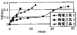 - 由圖可見,陶瓷刀具- 在正常磨損階段的磨損較劇烈,在很短時間內就達到了刀具磨鈍標準;陶瓷刀具1、3的耐磨性較好,在刀具正常磨損階段的磨損較緩慢、均勻,與目前生產中普遍采用的YT15硬質合金刀具相比,刀具耐用度有較大幅度提高。