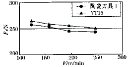 - 本試驗中,在相同切削用量(V=123、157、196、247m/min,f=1.1mm/r,ap=1mm)下得到的YT15硬質合金刀具和陶瓷刀具1的主切削力曲線如圖2所示。