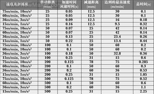 高速加工中心相比傳統(tǒng)加工中心的優(yōu)勢在哪里?或者說我們?yōu)槭裁匆l(fā)展高速加工中心?可以從下面表1、表2、表3中看出。由于加工中心的速度和加速度不同,移動同樣的距離所耗用的時間是不同的。