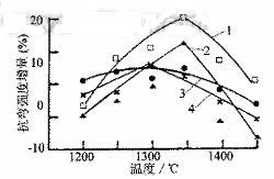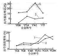 在兩種熱處理方式中,各取一個效果最佳的工藝對YG6、YG8、YG11C、YG15C、YG20C、YS30、YT14、YT5、YW2合金進行處理,試驗結(jié)果均為經(jīng)回火后的最后檢測結(jié)果,見圖1(抗彎強度增量為與燒結(jié)態(tài)對比的相對增量,以下各圖均同)。