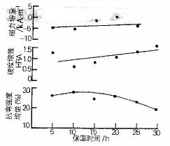 由于硬質(zhì)相(WC)與粘結(jié)相Co的膨脹系數(shù)相差約3倍,故淬火后的合金內(nèi)部存在應力,這種應力可能導致合金產(chǎn)生擇回火溫度(Tt)主要考慮兩點,一是盡量消除合金的應力,另外是使鈷相的析出降到最低。因此,回火溫度應該是選擇兩者俱佳的溫度。在低溫階段回火,隨著Tt升高,抗彎強度增大。這時的回火主要是要消除應力過程,而Co相析出物很少。根據(jù)Co相析出強化原理,微量Co析出物導致彌散強化。但隨著Tt的繼續(xù)升高,Co相析出物增多,合金矯頑力迅速增加,析出產(chǎn)物如Co3W3C、Co7W6、Co3W、Co7W2為脆性相,使合金組織結(jié)構(gòu)嚴重惡化,故使抗彎強度急劇下降。因此,對低鈷和中鈷合金,Tt應選擇高一些,高鈷合金Tt應選擇較低。如圖5所示,YG15合金回火時間在4~30h之間,抗彎強度、硬度及矯頑力都變化不大,因此,延長回火時間意義不大。