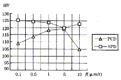 - 采用HX-200型顯微硬度計,在加載50g條件下對采用不同進給量切削時的工件表面顯微硬度進行測量。圖4所示為用PCD刀具和SPD刀具切削加工得到的表面顯微硬度值隨進給量的變化曲線。