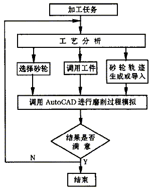 與一般的數(shù)控加工模擬軟件一樣,本文開(kāi)發(fā)的加工模擬系統(tǒng)也具有加工任務(wù)選擇、工藝分析、工具軌跡形成、圖象圖形模擬仿真、結(jié)果分析及數(shù)據(jù)保存等主要功能。五軸聯(lián)動(dòng)數(shù)控工具磨床的主要加工對(duì)象是各種異形回轉(zhuǎn)面刀具(如旋轉(zhuǎn)銼、模具銑刀等),所用砂輪主要有碟形、碗形、平形、單角和雙角錐面等形狀。由于工件和砂輪的形狀比較復(fù)雜,所以開(kāi)發(fā)該加工模擬系統(tǒng)的主要難點(diǎn)在于圖象圖形模擬仿真,而該模塊的功能水平將直接影響系統(tǒng)的實(shí)際使用效果。針對(duì)這種情況,我們建立了參數(shù)化工件庫(kù)和砂輪庫(kù),既方便了用戶使用,又可使系統(tǒng)自動(dòng)生成砂輪軌跡或?qū)胍延猩拜嗆壽E數(shù)據(jù),增加了系統(tǒng)的靈活性和適用性。該加工模擬系統(tǒng)的結(jié)構(gòu)框圖如圖1 所示。