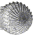 - 以加工等螺旋角等法向前角球頭旋轉(zhuǎn)銼(直徑Ø12mm,螺旋角20°)為例說(shuō)明加工模擬過(guò)程。單角錐面砂輪大圓直徑為50mm,錐角為60°,厚度為5mm,所需刀具軌跡數(shù)據(jù)可通過(guò)本系統(tǒng)程序生成,也可直接導(dǎo)入格式為ASCII 的數(shù)據(jù)文件(包括x、y、z三個(gè)方向的直線運(yùn)動(dòng)數(shù)據(jù)和繞A、C 兩個(gè)軸的旋轉(zhuǎn)運(yùn)動(dòng)數(shù)據(jù))。在模擬過(guò)程中,工件在水平面內(nèi)繞Z軸旋轉(zhuǎn)(C 軸),同時(shí)又繞自身軸線以角度A 回轉(zhuǎn);砂輪中心點(diǎn)(x,y,z)的位置坐標(biāo)在加工過(guò)程中不斷變化,而砂輪軸線方向不變,且與Y 軸平行,如圖2所示。模擬過(guò)程中的每一加工位置點(diǎn)均可利用砂輪與工件進(jìn)行相減布爾運(yùn)算而得到,最終即可實(shí)現(xiàn)對(duì)磨削加工的模擬。圖3 所示為加工模擬結(jié)果示意圖。