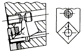 - 由于采用模塊化結構可使刀具實現一桿多用,且能快速換裝刀頭,因此極具經濟價值,國外工具制造商開發的重型可轉位車刀已廣泛采用模塊化結構。模塊式車刀的刀頭可根據加工需要設計成不同的結構、型式和幾何角度,可裝夾三邊、四邊、菱形、圓形及各種非標準型式的可轉位刀片,以滿足外圓、端面、仿形、切槽、螺紋、成型面等工序的加工。模塊式車刀刀頭與刀桿的聯接通常可采用機械夾緊和液壓拉緊兩種型式。加工外圓、端面的模塊式刀頭采用杠桿夾緊式結構為佳。杠桿式夾緊結構由于可將受力點設計(選擇)在最佳位置,使刀片兩側面與刀槽兩側面緊密接觸,同時還可形成向下的夾緊合力使刀片可靠地緊固定位(見圖4),因此較適用于大(進給)用量切削。