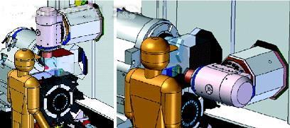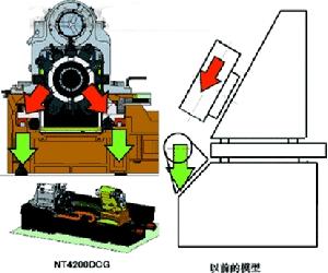 從圖3可以看到,為了實現具有和同類型車床和加工中心同樣的加工能力,車削方面選用水平床身,主副車削主軸和刀夾被安在同一平面上從而減少由床身熱變形引起的加工誤差。床身的支撐點均勻地分布在兩側,這樣當切削力施加于床身時,其與過去的機床(圖3左圖)相比就有更好的穩定性。主軸與刀架之間的熱變形引起的位移是車削零部件外徑、內徑加工精度的主要影響因素,該機床結構上的對稱性使得床身和刀架都具有很好的熱穩定性。該機床銑削方面采用臥式加工中心的主軸,機身采用箱中箱結構以及雙絲杠驅動以減少移動物質量,從而提高運動速度并且改善機床動態特性。