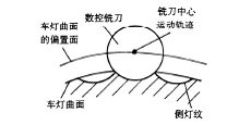 在對汽車車燈進行實體造型的過程中, 燈罩以及車燈的側面經常遇到如圖1所示的側燈紋。對于這種側燈紋的加工, 目前采用的方法是每一條側燈紋利用數控銑刀一次加工成型, 如圖2所示。由此可見, 側燈紋造型并不需要建立完整的3D 模型, 只需生成加工側燈紋過程中代表銑刀中心運動軌跡的空間曲線, 然后根據生成的空間曲線進行數控編程。