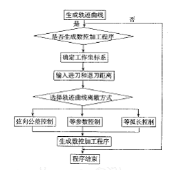 - 解決的方法是在每一個循環過程中設立1 個臨時坐標系, 所有臨時坐標系的某個坐標軸(如圖5所示的x 軸) 的正方向都位于曲面的一側。在每個臨時坐標系下讀取B 點的坐標值, 然后對坐標軸正方向一致的坐標值加上或減去進刀距離(圖5中應該選擇x 坐標值減去進刀距離) , 其他2 個坐標值不變,通過此3 個坐標值就能確定進刀點A。同理,由C 點得到D 點。最后取消臨時坐標系,返回工作坐標系, 由工作坐標系確定生成數控加工程序時的A、B 、C、D 4 點以及相交曲線離散的點集的坐標值,最后由這些坐標值生成數控加工程序。生成的數控加工程序只需按加工工藝修改某些參數, 如刀具轉速、進刀速度、冷卻液開關的控制等就能送入數控機床進行加工。圖6 為數控加工程序生成階段的程序流程圖。