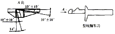 制造成形車刀時,關鍵是保證成形車刀的前角與后角。后角是由線切割加工,一次完成,前角刃磨時,由于兩處直線段不在同一豎直平面,若一次刃磨前角完成,兩直線段刀尖在高度方向有落差,這樣造成刀具型線與產品型線有0.2mm差異。因此刃磨前角時,分兩段刃磨,保證兩處直線段刀尖在同一水平面。