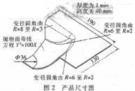 凹模圓角的取值合適與否直接關(guān)系到能否拉深成功。取值過(guò)小,則在材料流人凹模時(shí)彎曲阻力過(guò)大,引起直壁部分拉應(yīng)力過(guò)大,導(dǎo)致出現(xiàn)頸縮,甚至拉裂等缺陷;取值過(guò)大,則有效壓料面積減小,致使切向壓應(yīng)力增大,引起法蘭面起皺。該工件要求法蘭面與拋物面及直壁面相交處的圓角為r=2mm。但多次模擬結(jié)果表明,在定常壓邊力或直.線上升式壓邊力作用下會(huì)出現(xiàn)拉裂。綜合考慮成型質(zhì)量和成型工藝要求,決定將工件此處圓角改為漸變式設(shè)計(jì),其尺寸如圖2所示,然后在整形工序中再將此處圓角成型為r=2mm。同時(shí),在有限元模型中,也將凹模圓角設(shè)計(jì)為此種漸變式形式。