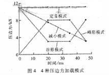 壓邊力控制曲線有定常加載模式、增加或減小模式及峰谷形加載模式3種類型。模擬計(jì)算和實(shí)際經(jīng)驗(yàn)表明,增加模式(如傳統(tǒng)的彈簧、橡膠壓邊形式)會(huì)對(duì)拉深過(guò)程產(chǎn)生不利影響,其他模式在特定的成型過(guò)程中表現(xiàn)各不相同[5]。根據(jù)經(jīng)驗(yàn)公式及實(shí)際生產(chǎn)情況,對(duì)定常模式、減小模式、峰形模式、谷形模式加載壓邊力(圖4)進(jìn)行成型過(guò)程模擬。