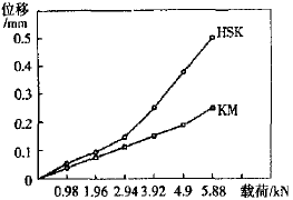 - 由美國肯納公司研究開發的KM(Kennametal )模塊系統——兩面夾刀具系統,其結構如圖2所示。它采用了三點定位方式,既可用于車床又可用于車削中心和加工中心。由于它結構獨特,具有高速、高剛性、高精度的優點,正在被越來越多的機床廠家所采用。與HSK刀柄相比,KM刀柄與主軸錐孔間的過盈量高約2~5倍,如KM6350(相當于BT40)的過盈量為10~25µm,其實際應用中,KM6350和KM4032的轉速分別達到36,000r/min和50,000r/min。HSK和KM兩系統的剛度比較如圖3。