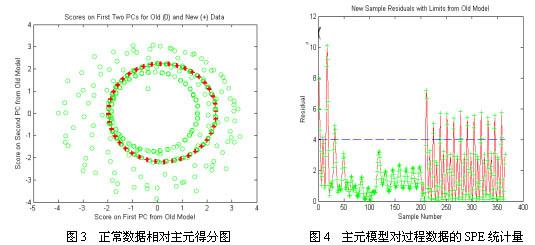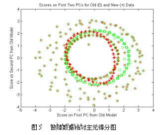 不同的異常狀況下,主元得分在平面圖上的位置是不同的,因而可以利用主元得分圖發現過程的異常波動。在相對得分圖中,分別以不同標記畫出正常狀況下主元得分的點簇位置,可以判斷過程是否出現異常偏離情況。