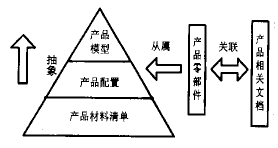 對于設計過程產生的最終結果——電子文檔,需要按一定的方式組織存儲起來,便于設計人員的查詢、引用和修改。以往的計算機管理軟件通常用文件夾的方式進行管理,這沒有完全反映文檔之間的關系。而且文檔的一些附屬信息沒有表達完整。在工廠中,傳統的設計文檔資料往往以產品及其零部件間關系(例如裝配關系)為線索進行組織管理,有鑒于此,建立一套產品零部件結構的模型,并將文檔與之關聯,形成一個完整的產品結構模型。集中對產品零部件及其描述文檔進行操作和維護。這樣,即便于用戶使用操作,又有利于數據的完整表達和維護,同時方便地為各個部門提供各種BOM視圖。該模型如圖所示,使用面向對象的方法,將產品結構歸納為三個層次: