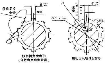 如圖2 所示,刀齒采用異側倒角,這樣既有利于磨制加工,又可在拉削時消除切削扭矩,保證花鍵齒形加工精度。在倒角邊磨制出后角,可減小側刃加工時后刀面的擠壓摩擦,從而減小拉削力,降低切削熱。拉刀經改進設計后,將齒升量提高到 SZ=0.11mm,這樣可使刀齒齒數(shù)相對減少,拉 刀長度縮短。此外,由于拉削前工序為預孔擴孔加工,加 工尺寸為Ø22-0.2mm,故可將拉刀導向部 分尺寸加大至Ø21.8-0.040-0.073mm,這樣可使拉刀的危險斷面直徑增大,拉刀強度相應提高。