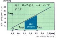 圖2展示了這種HPC方案的改進版:銑刀直徑42毫米,齒數4,切削速度250米/分。如果采用20米/分的進給速度,那么就可獲得最高2.5毫米的每齒進給量。盡管超過3.5毫米甚至5毫米的每齒進給量對刀具而言沒什么問題,但是機床方面就不太可能滿足這樣的要求。