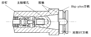 - Big-plus工具系統是日本大昭和精機公司開發的改進型7:24 錐柄工具系統(見圖3) 。該系統與現有的7:24 錐柄完全兼容,它將主軸端面與刀具法蘭間的間隙量分配給主軸和刀柄各一半,分別加長主軸和加厚刀柄法蘭的尺寸,實現主軸端面與刀具法蘭的同時接觸。裝入刀柄時伴隨主軸孔的擴張使刀具軸向移動達到端面接觸。