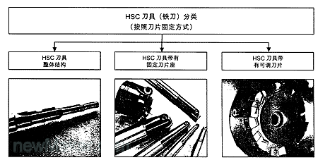 HSC刀具及刀具系統按其結構及刀片固定方式可分為三大類:整體結構,帶有固定刀片座及可調刀片座,見圖1。補充的分類方法可按照HSC刀具的應用領域進行。如平面銑削工序和在模具、模型及造型制造業中應用等。