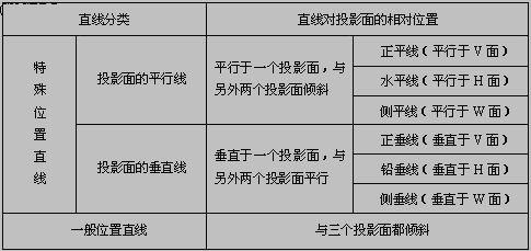 在三投影面體系中,直線有三種位置,其分類情況如表4.3-1所示。