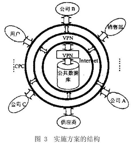 為開發某種新產品,位于不同國家的A 、B 、C 3 個企業的設計小組作為合作伙伴組成一個開發小組,他們將用一周的時間,通過Internet 來協同設計并制造出該產品。其中,C P C 軟件采用PTC 公司的Windchill,用以保證在產品開發過程的所有階段,3 個設計小組均能共享和訪問到信息;VPN 采用LinkTrust CyberwallTM 系列的防火墻技術,同時所有數據均組織在統一的數據庫環境下,用以確保在這3 個公司中生產的不同部件配合的天衣無縫。具體實施方案的結構如圖3 所示。