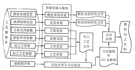 參數化輸入模塊是編程軟件實現人機信息交互的接口。該模塊通過輸入加工信息,從工藝數據庫中調出相關的工藝參數,然后根據具體加工對象、加工條件和加工要求,對工藝信息進行必要的修改,生成供后續刀位計算與刀位驗證模塊和后置處理模塊使用的數據文件。具體有:數控系統設置,機床設置,刀具設置,工序設置,砂輪設置,工藝設置。