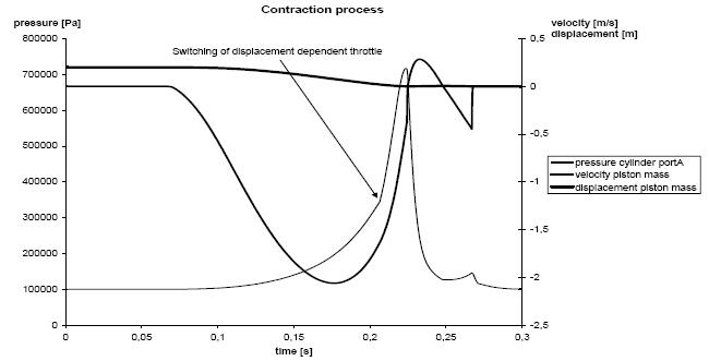 作為一個例子,上圖給出了活塞的速度、位移和氣缸內腔壓力的時間變化曲線。通過比較兩個過程的壓力曲線就可以評價不同的開關操作的影響。氣缸收縮時,在特定位置增加風門阻力,就能夠使較高的速