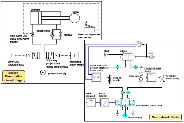 使用SimulationX 搭建下面的仿真模型(基于左邊的氣動回路圖解)。