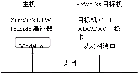 實(shí)時(shí)代碼在主機(jī)上,用Tornado提供的交叉編譯器編譯。通過(guò)RTW的Tornado實(shí)時(shí)目標(biāo)生成目標(biāo)文件(vxmodel.lo),可通過(guò)Tornado集成開發(fā)環(huán)境的WindSh下載到VxWorks目標(biāo)機(jī)。實(shí)時(shí)程序在VxWorks目標(biāo)機(jī)上執(zhí)行,通過(guò)IO設(shè)備和外部硬件交換數(shù)據(jù),并保持和主機(jī)之間的相互通信。
