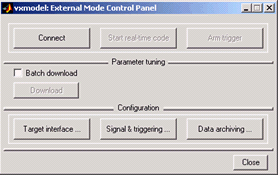 ld 請(qǐng)注意要保證lo文件在WindSh的工作路徑下。VxWorks實(shí)時(shí)程序定義了一個(gè)函數(shù)rt_main(),用來(lái)創(chuàng)建和執(zhí)行模型代碼、完成與Simulink的通信(如果選擇了外部模式方式)。rt_main函數(shù)在文件rt_main.c中定義,這個(gè)文件位于目錄%matlabroot% twc ornado中。 在WindSh窗口中調(diào)用rt_main函數(shù),開始運(yùn)行程序:sp(rt_main,vxmodel,"-tf 100 -w ","*",0,30,17725) 參數(shù)的含義分別是: rt_main()是實(shí)時(shí)程序定義的函數(shù),用來(lái)產(chǎn)生任務(wù)執(zhí)行代碼和與Simulink進(jìn)行通信; 運(yùn)行后我們可以看到目標(biāo)機(jī)上的屏幕上顯示: (5) 建立連接 在External Target Interface對(duì)話框中的MEX-file arguments指定目標(biāo)機(jī)的IP、冗長(zhǎng)度和TCP端口號(hào),如圖6所示,就可以建立連接了。 圖6 External Target Interface對(duì)話框設(shè)置 打開External Mode Control Panel,如圖7所示。點(diǎn)擊Connect按鈕,執(zhí)行Start real-time code,可以看到Scope上的圖形輸出。此時(shí),可以改變模型的參數(shù)(如增益的數(shù)值),參數(shù)下載后Scope的曲線將隨之改變。仿真時(shí)間結(jié)束以后,可以看到產(chǎn)生了一個(gè)external.mat文件,由目標(biāo)機(jī)會(huì)傳到主機(jī),放在Tornado的安裝根目錄下。 圖7 External Mode Control Panel對(duì)話框 4、結(jié)論 針對(duì)Matlab的仿真特性和VxWorks操作系統(tǒng)的實(shí)時(shí)特點(diǎn),本文介紹了RTW面向Tornado(VxWorks)實(shí)時(shí)目標(biāo)的運(yùn)行結(jié)構(gòu),并且較為詳細(xì)的闡述了Tornado(VxWorks)實(shí)時(shí)目標(biāo)的具體實(shí)現(xiàn)流程,實(shí)現(xiàn)了Simulink在Tornado(VxWorks)實(shí)時(shí)目標(biāo)下的仿真。#p#分頁(yè)標(biāo)題#e# 在結(jié)合相關(guān)文檔的同時(shí),筆者加入了親身實(shí)驗(yàn)的經(jīng)驗(yàn),增補(bǔ)了一些必要的內(nèi)容,完善了實(shí)驗(yàn)的具體步驟,降低了為讀者今后實(shí)驗(yàn)的調(diào)試難度。