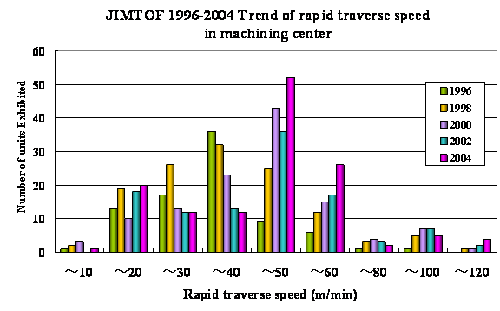 圖1(1996年到2002年JIMT展會加工中心的移動速度 左豎軸 展出的臺數,橫軸機床移動速度)
