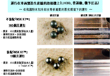 圖4是一個裝有K1和不裝有K1的導軌的實際使用比較例子,其用途是用在汽車焊接生產線上的機器人,使用環境非常惡劣。原來未使用K1時,不滿一年就會因潤滑不良而發生鋼球阻塞等故障。由照片亦可看到鋼球及導軌有生銹的情況。用了K1,使用一年后進行分解觀察,鋼球和滾道磨損很少,亦沒有發生生銹的情況,使用情況良好。