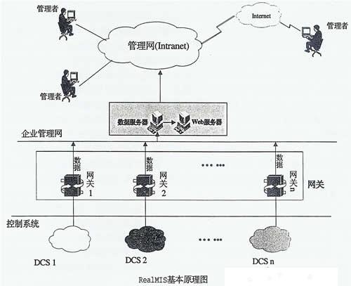 下圖是RealMIS的基本原理圖。在企業(yè)的控制系統(tǒng)與管理網(wǎng)之間設(shè)置一臺(tái)網(wǎng)關(guān)機(jī)(此網(wǎng)關(guān)機(jī)可以由控制系統(tǒng)中的服務(wù)器或工作站兼做),分別連通控制系統(tǒng)與管理網(wǎng),起到數(shù)據(jù)橋梁的作用。網(wǎng)關(guān)機(jī)從控制系統(tǒng)區(qū)的數(shù)據(jù)后,將它們進(jìn)行適當(dāng)轉(zhuǎn)換后發(fā)送到管理網(wǎng)的數(shù)據(jù)服務(wù)器,管理這就可以在辦公室里接收數(shù)據(jù),以系統(tǒng)模擬圖的方式觀測(cè)實(shí)時(shí)的生產(chǎn)情況了。實(shí)時(shí)及歷史數(shù)據(jù)的查詢既可以通過(guò)C/S(客戶機(jī)/服務(wù)器)方式用程序查看,也可以通過(guò)B/S(瀏覽器/服務(wù)器)方式用WEB瀏覽器進(jìn)行本地或遠(yuǎn)程查詢。同時(shí),管理網(wǎng)中的數(shù)據(jù)服務(wù)器對(duì)接收到的實(shí)時(shí)數(shù)據(jù)進(jìn)行優(yōu)化處理,并存儲(chǔ)在數(shù)據(jù)庫(kù)中,供管理者分析、決策。