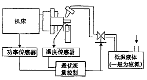 - 自動控制低溫流體的噴射量,以維持加工區(qū)的溫度在Topt狀態(tài):一方面,當檢測到的加工區(qū)溫度偏離Topt,則通過反饋控制器來調(diào)節(jié)噴射流量,另一方面當加工系統(tǒng)輸入功率發(fā)生變化,則直接通過前饋控制器超前調(diào)節(jié)噴射流量,以維持最佳低溫加工狀態(tài)。其控制系統(tǒng)框圖如圖3所示。