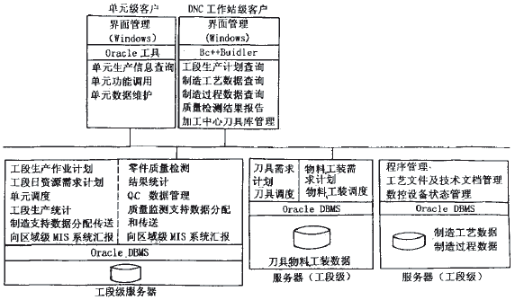 - 工段級服務器中包含有各種制造信息,如制造過程信息(機床運行狀況、加工狀況等)、制造管理信息(當天作業計算等)、工藝數據(NC 代碼含加工、測量)、制造資源數據(刀、夾、量具、毛坯、原材料等)。