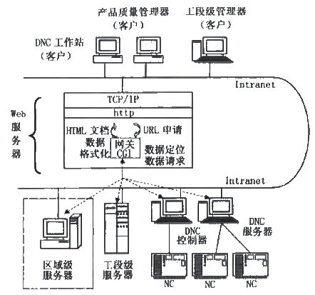 - 基于Web服務器的三層體系結構設計的DNC系統其結構如圖2。虛線框中的區域級服務器不包含在DNC系統中,在此表示DNC 系統與上一級系統通過WWW集成的方案。