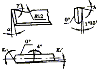 - 主切刀 主要用來(lái)切除工件加工余量,要求具有一定的強(qiáng)度和韌性,其刃口選用寶劍式刃口,如圖2所示。
