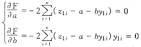 (z1i-a-by1i)2- 按極值原理,將(22)式分別對a、b求偏導數,并令其為零,則可求得F(a,b)為最小值的a、b值。