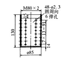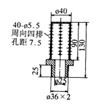 如圖3所示為國(guó)內(nèi)某廠所生產(chǎn)的空氣分配閥用消聲器,所用閥的通徑為25mm,40個(gè)φ5.5的孔總面積相當(dāng)于閥通流面積的1.936倍,所以,排氣是很流暢的。孔距b=7.5mm,孔距b和孔徑d=5.5之比為b/d=1.36mm,孔距實(shí)在太小,加之孔徑5.5 mm遠(yuǎn)遠(yuǎn)超過(guò)1~3mm,所以降噪性能很差,實(shí)測(cè)的降噪量?jī)H為2.5dB。因此,應(yīng)積極提倡不用該消聲器。