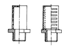 目前,國(guó)產(chǎn)的空氣分配閥排氣口上很多都采用這類消聲器,它具有體積小,降噪量大等優(yōu)點(diǎn)。這類消聲器帶有大量的細(xì)小孔隙,可將排放氣流濾成無(wú)數(shù)個(gè)小的氣流,使氣體壓力被降低,流速被擴(kuò)散減小,從而達(dá)到降噪的目的。這類消聲器可分為微孔燒結(jié)型和多層金屬絲網(wǎng)型(或稱為篩板型),如圖4所示,微孔燒結(jié)型是將金屬、塑料或陶瓷等球狀顆粒,在一定的溫度和壓力下,在模具內(nèi)燒結(jié)成帶微孔(孔隙小到絲米級(jí))的消聲器,目前使用最多的是銅顆粒燒結(jié)型。多層金屬絲網(wǎng)型是將具有良好防銹功能的銅網(wǎng)纏繞在消聲器內(nèi)具有較好剛度的穿孔護(hù)面板上,形成多層(可達(dá)20層)銅網(wǎng),然后在外面加裝金屬護(hù)面套筒。