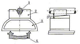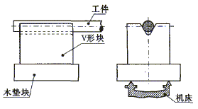 粗車時,可采用如圖1所示的支架,支架由V形塊和木墊塊組成,木墊塊壓在機床導(dǎo)軌上。半精車、精車時可采用如圖2所示的托架,托架是在加工過程中起減振作用的主要輔具,托架由兩塊制有3°斜面的木質(zhì)(紅松)托塊組成,上托塊的上面制成V型托口,這可使工件與上托塊在互相作用時能夠形成不完全碰撞,受力時一部分功能將受到損失,以達到減小反作用力的目的。根據(jù)實踐經(jīng)驗,V型夾角a=30°~50°為宜,輔具安放數(shù)量視工件長徑比及工件長度而定,當(dāng)長徑比大于80、工件長大于1500mm以上時,每隔600~800mm放置一個。