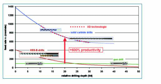 圖注:進給速度;XD技術;整體硬質合金鉆頭;HSS-E鉆頭;+600%生產率;相對鉆削深度;整體硬質合金鉆;槍鉆。