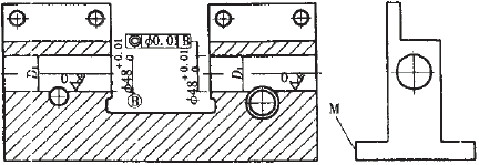1 浮動鏜刀加工 1) 將零件固定在拖板上,主軸夾緊刀桿先粗鏜f48內孔,因為兩孔跨距較大且孔徑較小,宜采用調頭18Mm鏜削,加工工藝方法如下:①先加工基準面M與兩孔的中心連線平行,在鏜削前找正工藝基準M與大拖板平行,平行度≤0.01mm/m,鏜削D1孔;②D1孔鏜削完畢后調頭,同樣找正工藝基準M,平行度≤0.01mm/m,然后移動中拖板找正D1內孔,跳動不大于0.005,鏜削D2孔,以上兩孔均留加工余量ap=0.03~0.06mm。