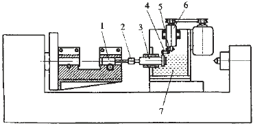 2 脈沖研磨 按圖3所示自制一套研磨工具,仍然在C630車床上加工,主軸夾緊工件旋轉,研磨工具固定在拖板上,電機通過偏心輪5帶動研磨滑軸3作脈沖運動,該方法較好地保證了孔的尺寸精度及粗糙度,但因兩孔中間斷開,研磨頭無法連續工作,仍然無法糾正鏜孔時產生的兩孔同軸度的偏差,我們曾考慮將兩斷孔整體鑄造,一體研磨,加工后將中間多余部分去掉,但這很容易產生新的應力變形,使同軸度發生變化。