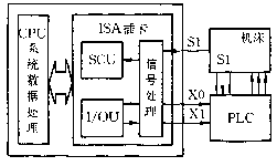 在換刀的控制中,我們對ISA插卡做了如下的處理(圖2)。當換刀指令M06 TXX發出后,系統程序根據當前刀號以及指令的目標刀號判斷刀盤的旋轉方向并計算出旋轉步數。然后通過低I/OU發出控制信號X0、X1至PLC控制旋轉電機的正、反轉(X0、X1的控制狀態如表1)。刀盤每轉過一個刀號,接近開關S1都會發出一個信號S1輸入至SCU,SCU計數一次,直到SCU計數值等于所需旋轉步數時,刀盤轉到目標刀號,系統程序控制I/OU輸出控制信號(0,0)到PLC,使刀盤旋轉電機停止。