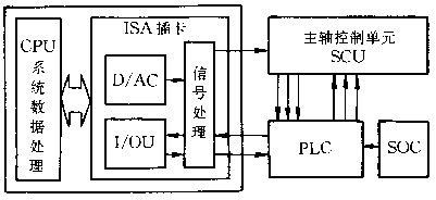 將SKY數控系統與INDRAMAT模擬伺服主軸控制單元進行通訊,是改造主軸控制部分必不可少的步驟。通訊的實現也是由ISA插卡和PLC連接主軸控制單元完成的(圖3)。當系統收到主軸旋轉指令時,系統根據指令的轉速大小和當時主軸轉速倍數的乘積,發送一個二進制數碼(以補碼形式,易判斷其正負)給ISA卡的D/AC,將其轉換成模擬信號輸出到SCU中。系統發出的是一個32位二進制數碼,D/AC轉換成+10~-10的模擬信號,轉速由SCU中設定的最大轉速vsmax和當時的模擬電壓值U確定,計算公式為:vs=U*vsmax/10。當U值為正量,主軸旋轉方向為順時針;U值為負時,主軸旋轉方向為逆時針。當系統收到指令M03 SXXXX,則指令值為正,U值為正,主軸順時針旋轉;若指令為M04 SXXXX,則指令值為負,U值為負,主軸逆時針旋轉。