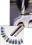 這些可更換刀尖的刀具不是“插入式”刀具。相反,這種刀具改變了插入式硬質(zhì)合金刀具的原理,使其變成小直徑刀具,它們通常不能作為可換刀片的候選對(duì)象。完全可更換的刀尖要么擰入要么牢牢地固定在鋼質(zhì)刀身上,鋼質(zhì)刀身充當(dāng)?shù)秺A,因此不受硬質(zhì)合金刀具使用壽命的影響。上圖顯示了這種刀具的兩個(gè)例子:一個(gè)是具有可更換尖端的“QwikTwist”鉆頭,一個(gè)是“ChipSurfer”模塊化銑削系統(tǒng)。