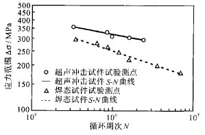 使用超聲沖擊的方法提高焊接接頭的疲勞壽命,其效果顯著。 該方法可以很大程度地提高接頭的疲勞強度,使焊接接頭接近母材的疲勞強度,甚至高于母材。 所以,設計合理、接頭焊接質量良好且經超聲沖擊適當處理過的承受低應力動載的焊接結構,焊接接頭將不再是薄弱環節。