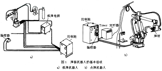 焊接機器人主要包括機器人和焊接設備兩部分。機器人由機器人本體和控制柜(硬件及軟件)組成。而焊接裝備,以弧焊及點焊為例,則由焊接電源,(包括其控制系統)、送絲機(弧焊)、焊槍(鉗)等部分組成。對于智能機器人還應有傳感系統,如激光或攝像傳感器及其控制裝置等。圖1a、b表示弧焊機器人和點焊機器人的基本組成。